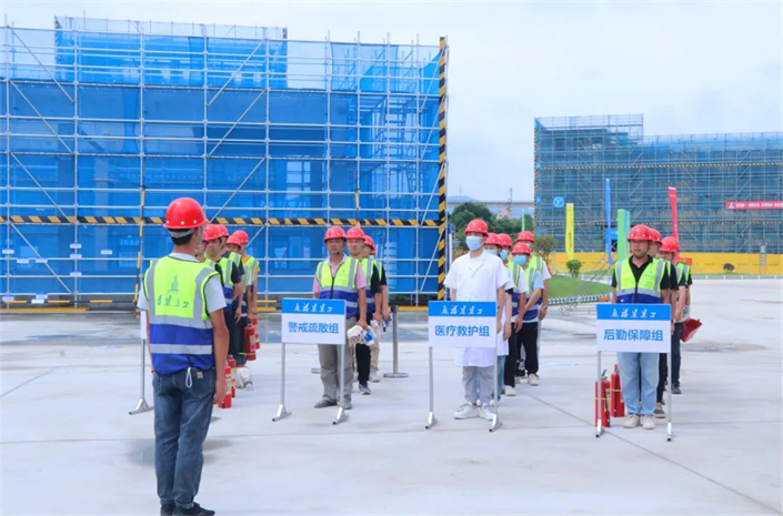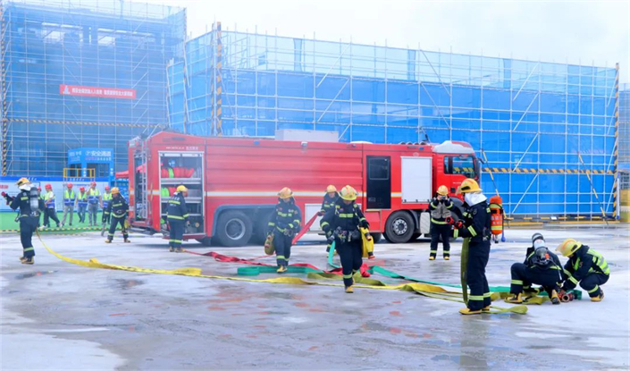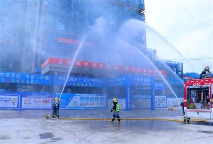 現(xiàn)場還組織消防應(yīng)急救援實(shí)操演練,模擬施工現(xiàn)場用電不規(guī)范導(dǎo)致火災(zāi)。事故發(fā)生后,工地迅速啟動(dòng)消防應(yīng)急預(yù)案,施工單位組建應(yīng)急救援小組迅速反應(yīng),并第一時(shí)間請求消防及救護(hù)援助。隨后,消防應(yīng)急車輛和救援隊(duì)伍也趕赴現(xiàn)場進(jìn)行滅火和救援工作。演練過程中,各崗位人員反應(yīng)迅速,協(xié)同配合,疏散過程安全有序。