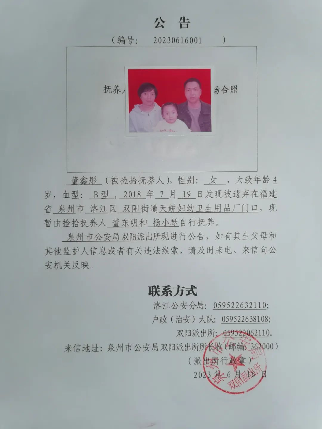 董鑫彤(被撿拾撫養(yǎng)人),性別:女,大致年齡4歲,血型:B型,2018年7月19日發(fā)現(xiàn)被遺棄在福建省泉州市洛江區(qū)雙陽街道天嬌婦幼衛(wèi)生用品廠門口,現(xiàn)暫由撿拾撫養(yǎng)人董東明和楊小琴自行撫養(yǎng)。泉州市公安局雙陽派出所現(xiàn)進(jìn)行公告,如有其生父母和其他監(jiān)護(hù)人信息或者有關(guān)違法線索,請及時(shí)來電、來信向公安機(jī)關(guān)反映。