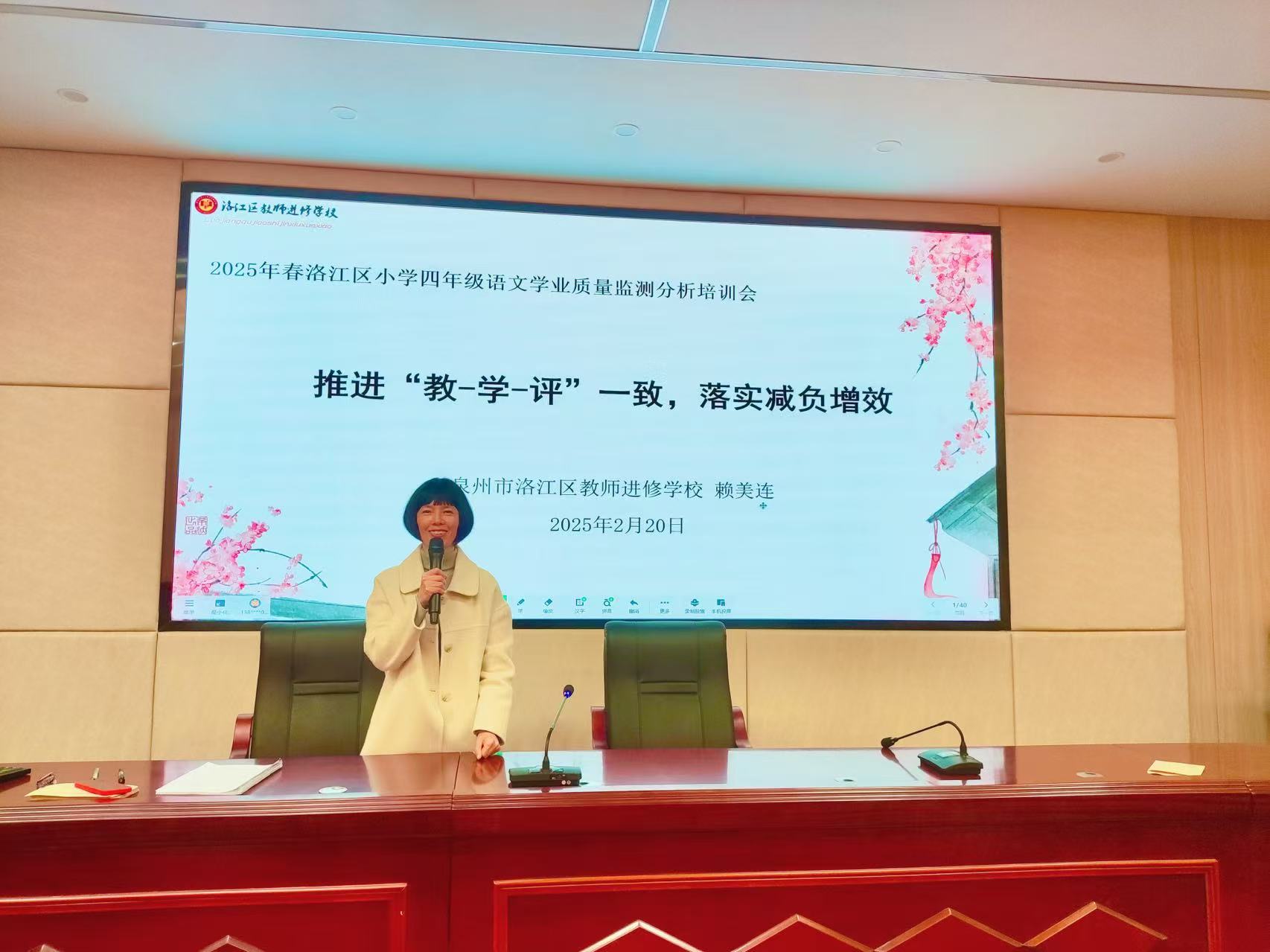 會議分三個(gè)議程進(jìn)行。第一個(gè)議程作四年級學(xué)業(yè)質(zhì)量監(jiān)測培訓(xùn)。賴美連老師作《推進(jìn)“教-學(xué)-評”一體化,落實(shí)減負(fù)增效》專題講座。賴?yán)蠋熓紫葟娜珖逃髸窈土?xí)近平總書記關(guān)于教育的重要論述談起,帶領(lǐng)老師們再次學(xué)習(xí)2023年教育部辦公廳印發(fā)《基礎(chǔ)教育課程教學(xué)改革深化行動方案》和《義務(wù)教育語文課程方案》《義務(wù)教育語文課程標(biāo)準(zhǔn)(2022年)》《統(tǒng)編修訂版語文教科書》等核心內(nèi)容,明確教育目標(biāo)。接著,從學(xué)業(yè)質(zhì)量監(jiān)測的目的、工具、內(nèi)容、樣例、教學(xué)建議等五個(gè)方面深入淺出地分析了為什么要進(jìn)行學(xué)業(yè)質(zhì)量監(jiān)測?怎么監(jiān)測?如何更好地應(yīng)對學(xué)業(yè)質(zhì)量監(jiān)測?既有典型的樣例展示,又有前沿理論引領(lǐng)及其可操作、可借鑒的教學(xué)策略分享。