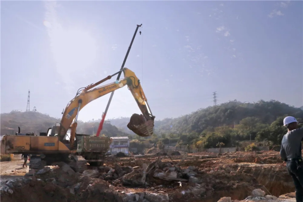 在洛江信興汽車城三期施工現(xiàn)場,挖掘機(jī)正在開挖土地,運(yùn)載沙石的土方車也在工人有序的指揮下緩速開進(jìn)工地,現(xiàn)場一派繁忙景象。