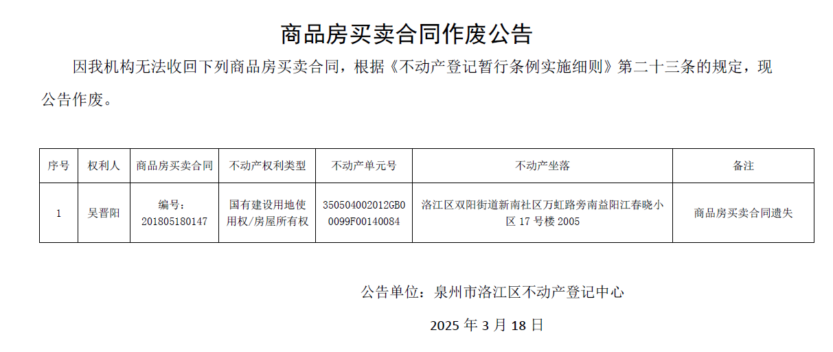 吳晉陽商品房買賣合同作廢公告